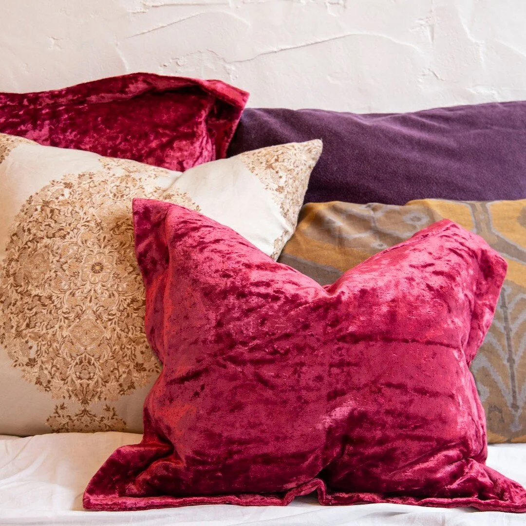 A sumptuous stack of cushions. Silk and wool velvets mixed with antique brocade from Florence.